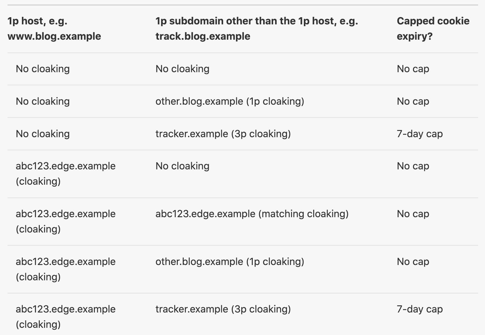 이제 ITP는 third-party CNAME 은닉 요청을 탐지하고 HTTP 응답에 설정된 쿠키의 만료 기간을 7일로 제한합니다. third-party CNAME 클로킹은 first-party 도메인과 다른 CNAME을 통해 해결되는 first-party 하위 리소스로 정의됩니다. 예를 들어, 전체 사이트가 소위 에지 서버를 사용하는 경우 CNAME을 은폐할 수 있습니다.
